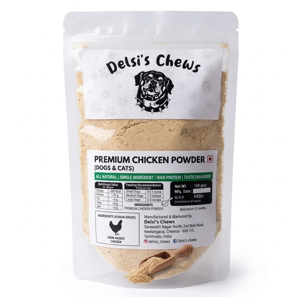 Delsi’s Chews Premium Chicken Powder for Dogs & Cats is a highly nutritious natural food topper made from real chicken that is carefully dehydrated and finely ground to preserve its natural flavour, protein content, and nutrients. This premium powder enhances your pet’s regular meals while providing a clean and healthy protein boost.