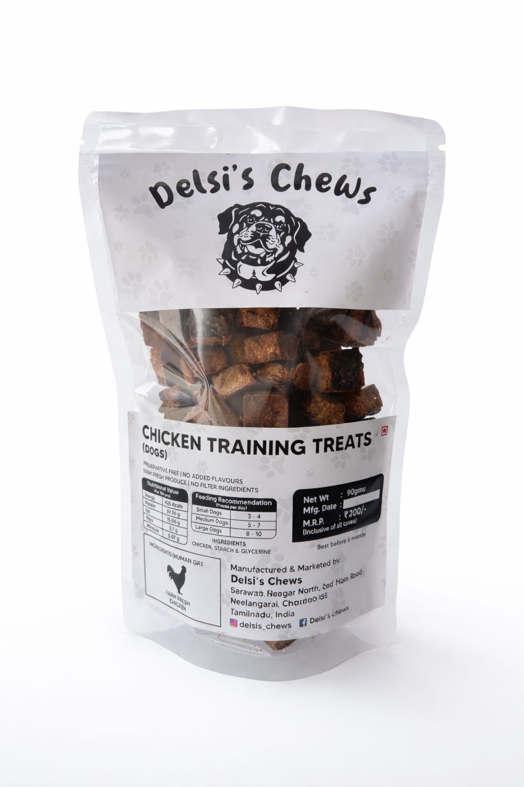 Delsi’s Chews Chicken Training Treats are specially crafted, bite-sized dog treats designed for effective training and everyday rewards. Made using real chicken and gently dehydrated, these small cubes are easy to chew, highly palatable, and perfect for positive reinforcement.