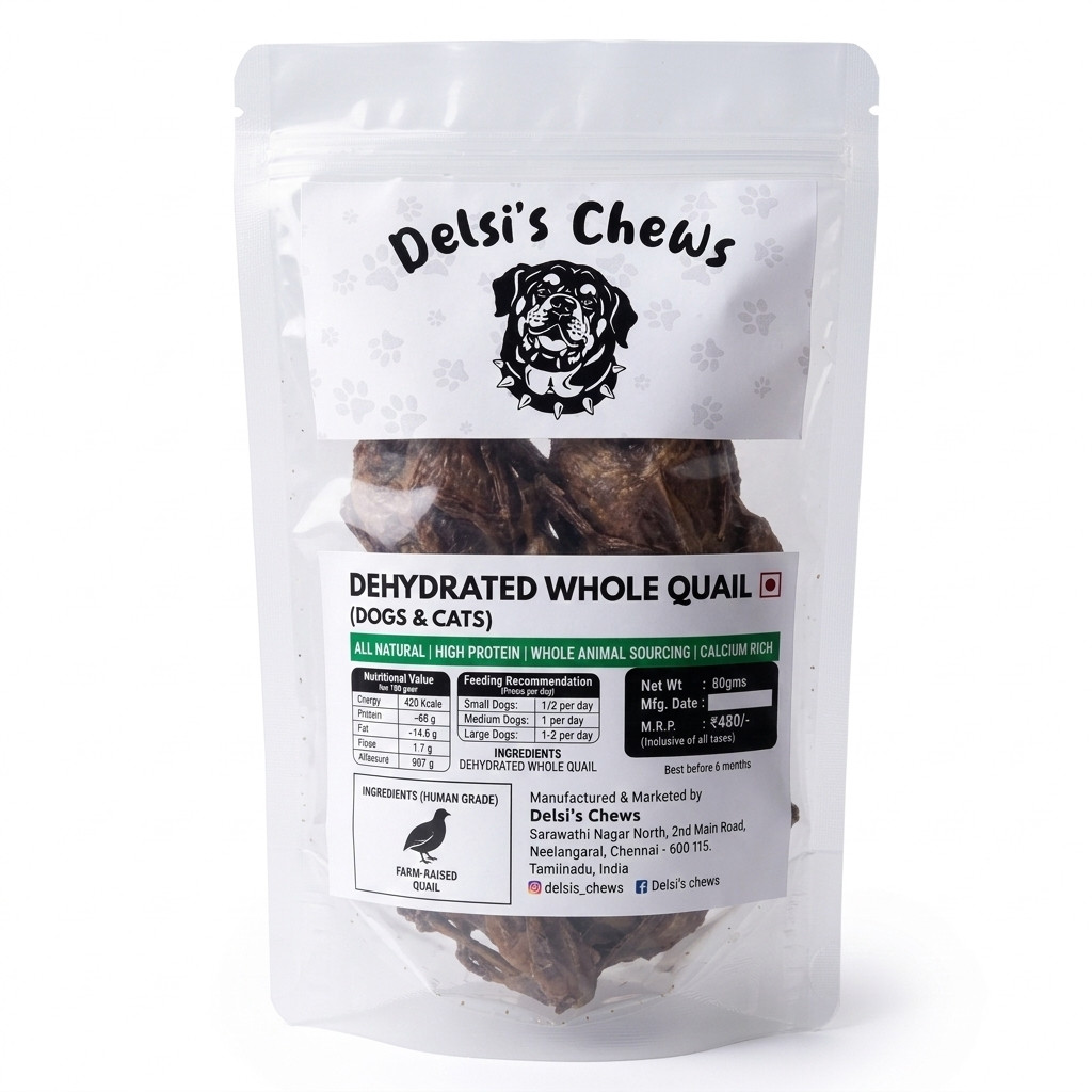 Delsi’s Chews Dehydrated Whole Quail is a premium natural whole-prey treat made from farm-raised quail, carefully dehydrated to preserve its natural flavour, nutrients, and chewiness. This protein-rich treat provides a biologically appropriate snack that closely mimics what pets would naturally consume in the wild.
