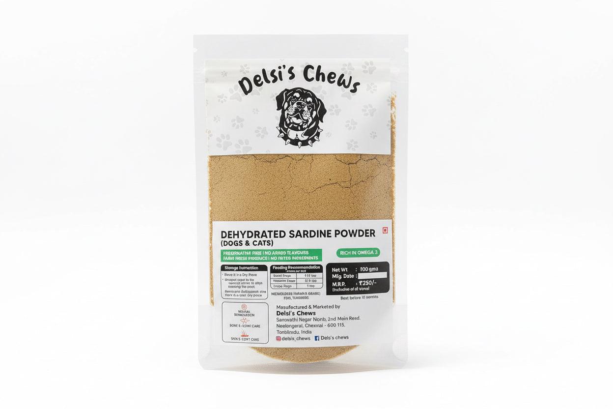 Delsi’s Chews Dehydrated Sardine Powder is a highly nutritious natural supplement made from real sardines that are gently dehydrated and finely ground to preserve their natural nutrients, aroma, and flavour. This fish powder is an excellent food topper that enhances your pet’s meals while providing essential Omega-3 fatty acids, protein, and minerals.