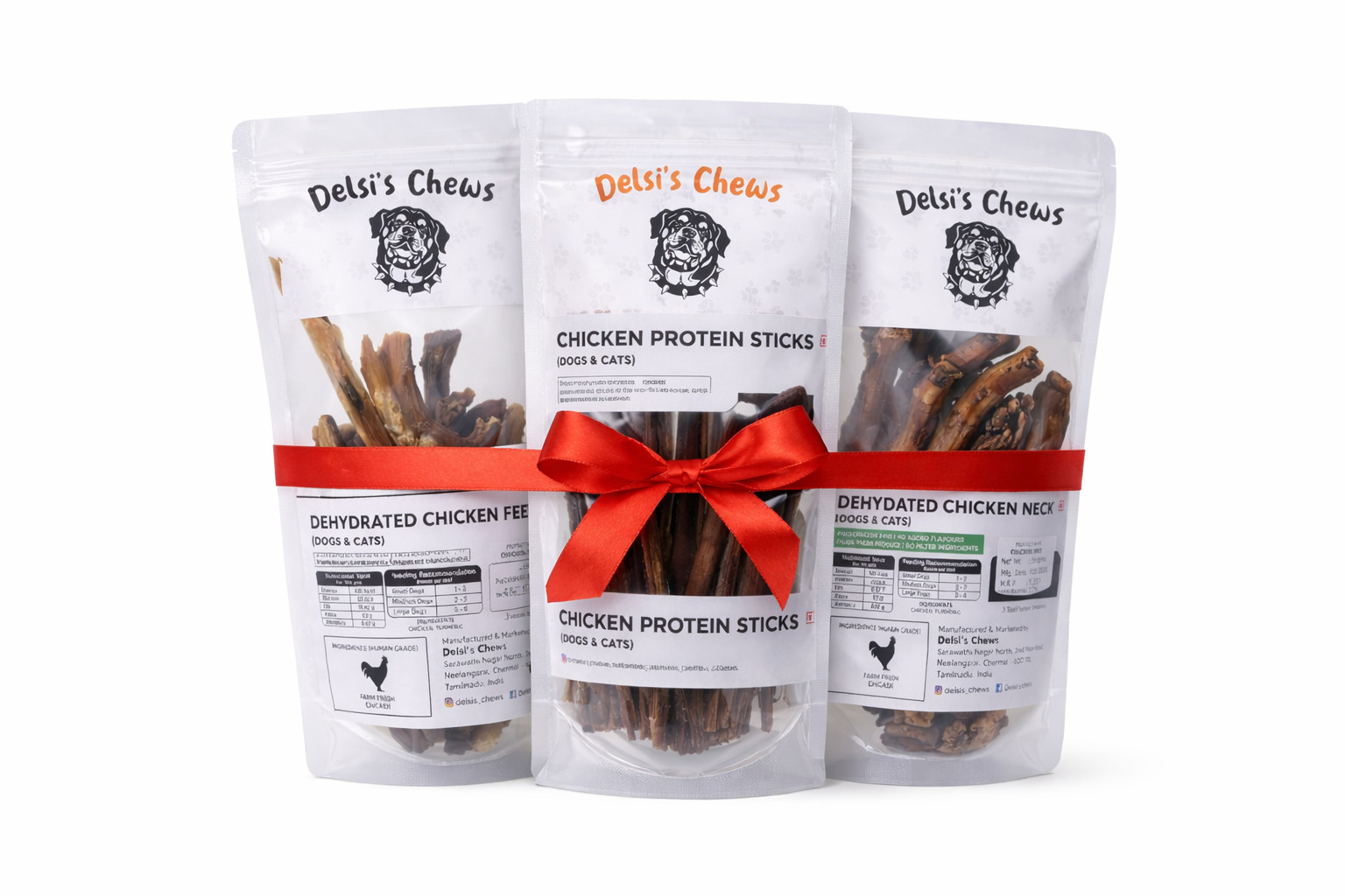 Delsi’s Chews Trial Combo Pack is a carefully curated selection of three premium natural chicken treats designed to give your pets a healthy and delicious variety. This combo includes Chicken Protein Sticks, Dehydrated Chicken Neck, and Dehydrated Chicken Feet, all made from farm-fresh chicken and gently dehydrated to preserve natural nutrients, flavour, and chewiness.